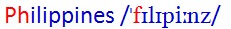 1. 留意Philippines重音在第一音節, 如果沒有字緊隨其後, 第三音節/piːnz/讀較低音, 有別於粵語的第1聲"賓", 而是第4聲, 近似"便宜"的"便"(粵音/pin4/.)